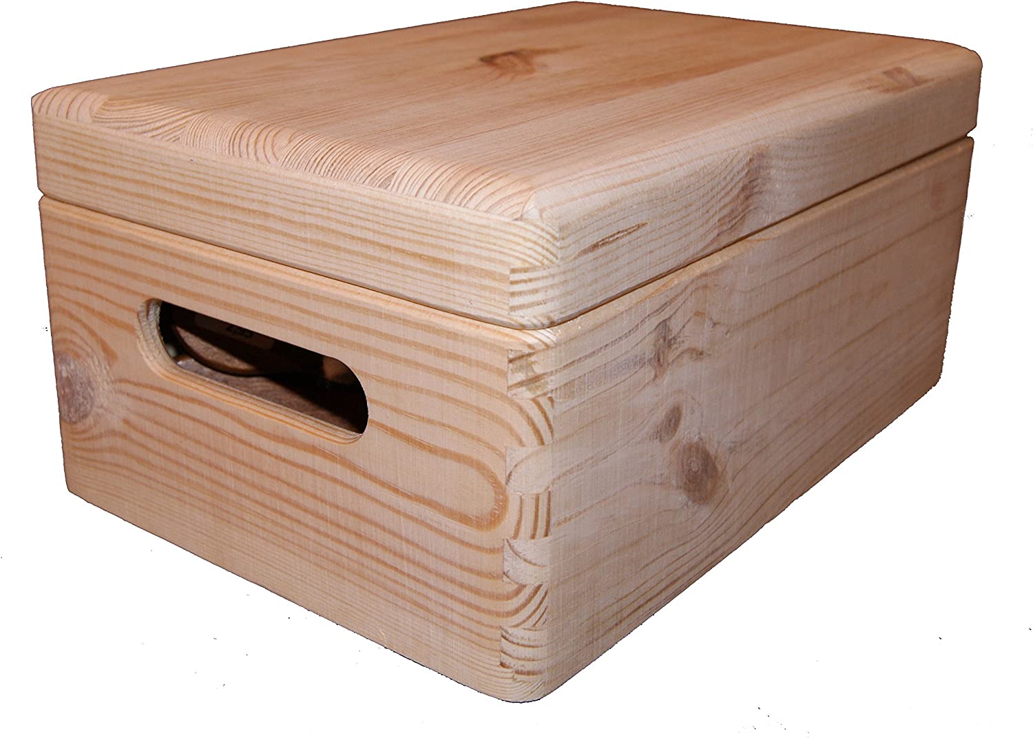 Die Box wurde aus unbehandeltem und unlackiertem Kiefernholz gefertigt und ist FSC-zertifiziert (100% Holz aus vorbildlicher Waldwirtschaft). Das ermöglicht eine nachträgliche Lackierung oder Behandlung mit Dekor-Öl. Der Deckel ist mit einem innen angebrachten Halteband versehen und kann so bequem aufgeklappt werden. Die Kanten und Ecken sind abgerundet und seitlich wurde die Kiste mit zwei praktischen Eingriffen versehen.